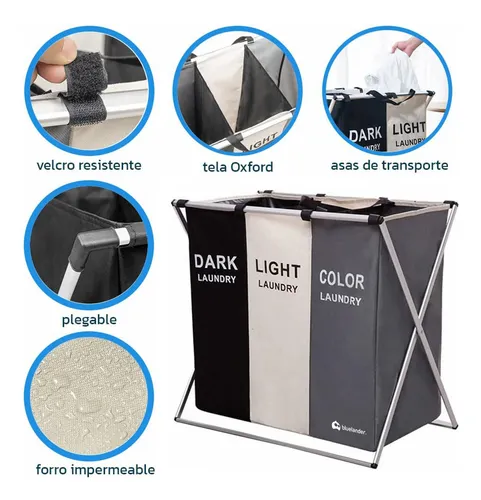 - Tres compartimentos (ropa oscura, ropa clara, ropa de color)